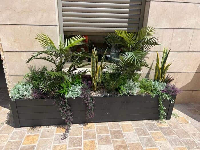 אדנית אלומיניום באורך 2.5 מטר עם צמחיה מלאכותית שמתאימה במיוחד לשמש